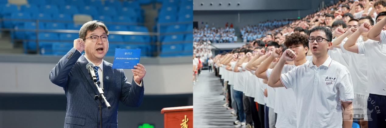 周翔院士带领全体研究生新生作学术道德与科研诚信宣誓:“自强弘毅,求是拓新,做珞珈学脉的传承者;覃思精研,守道善学,做学术研究的耕耘者;进德修业,明诚慎独,做学术道德的捍卫者;砥砺笃行,追求卓越,做学术创新的探索者。”学术有道,诚信为德,这既是对自身学术理想的郑重回答,也是肩负起民族复兴使命的勇敢宣言。