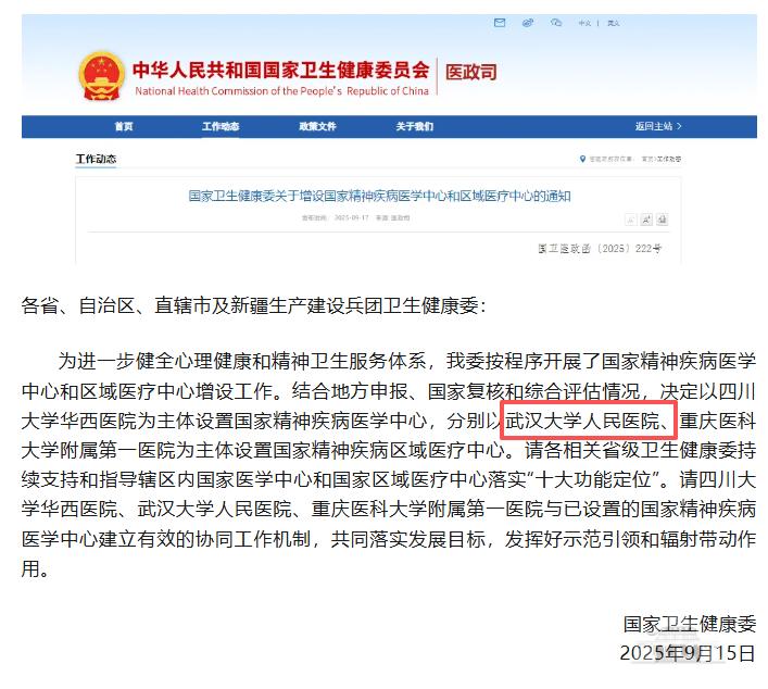 新闻网讯(通讯员任艺萱)9月17日,国家卫生健康委发布关于增设国家精神疾病医学中心和区域医疗中心的通知,决定以武汉大学人民医院为主体设置国家精神疾病区域医疗中心。这不仅是湖北第一个临床类国家区域医疗中心,是武汉大学人民医院(湖北省人民医院)学科建设的又一重大突破,也标志着医院疑难危重症诊疗和高质量服务人民生命健康的示范、辐射、引领能力迈上新台阶,彰显医院“医疗国家队”风范。