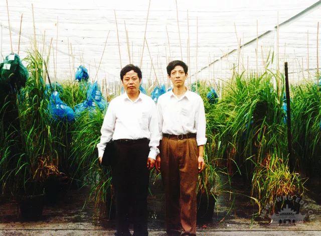 1993年,朱英国院士(左)和杨代常教授(右)参观国际水稻所野生稻圃